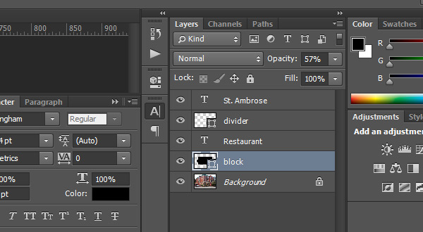 Перетащите подкладку под слой с текстом и укажите ей Opacity/Непрозрачность в 57%.