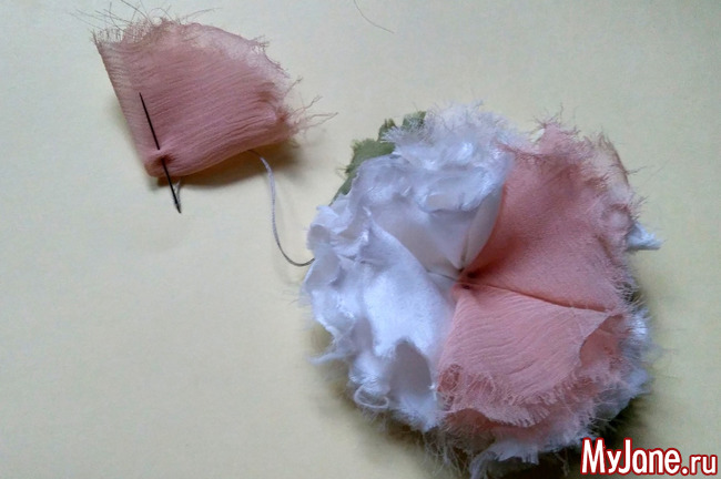 Делаю из атласной ленты “лепестки” (2 длинных и 3 коротких), закрепляю их.