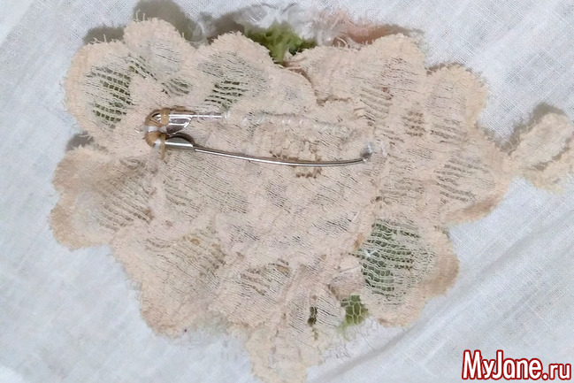 Обратную сторону броши закрываем фрагментом кружева и пришиваем застежку-булавку. Я не случайно выбрала для застежки булавку, а не специальную основу для броши: для такой нежной и легкой броши булавка подходит лучше, проверено!
