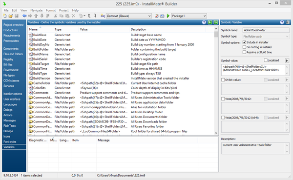 - Опции инсталлятора: с помощью редактора можно отредактировать текст диалогов. Предусмотрена гибкая настройка локализаций, InstallMate поддерживает 19 языков по умолчанию. Можно создать один дистрибутив с несколькими локализациями либо несколько проектов с одним языком. В этом же разделе доступны пользовательские действия, а также переменные — включая 250 предустановок. Расширить функциональность пакета можно с помощью расширений и DLL-библиотек.